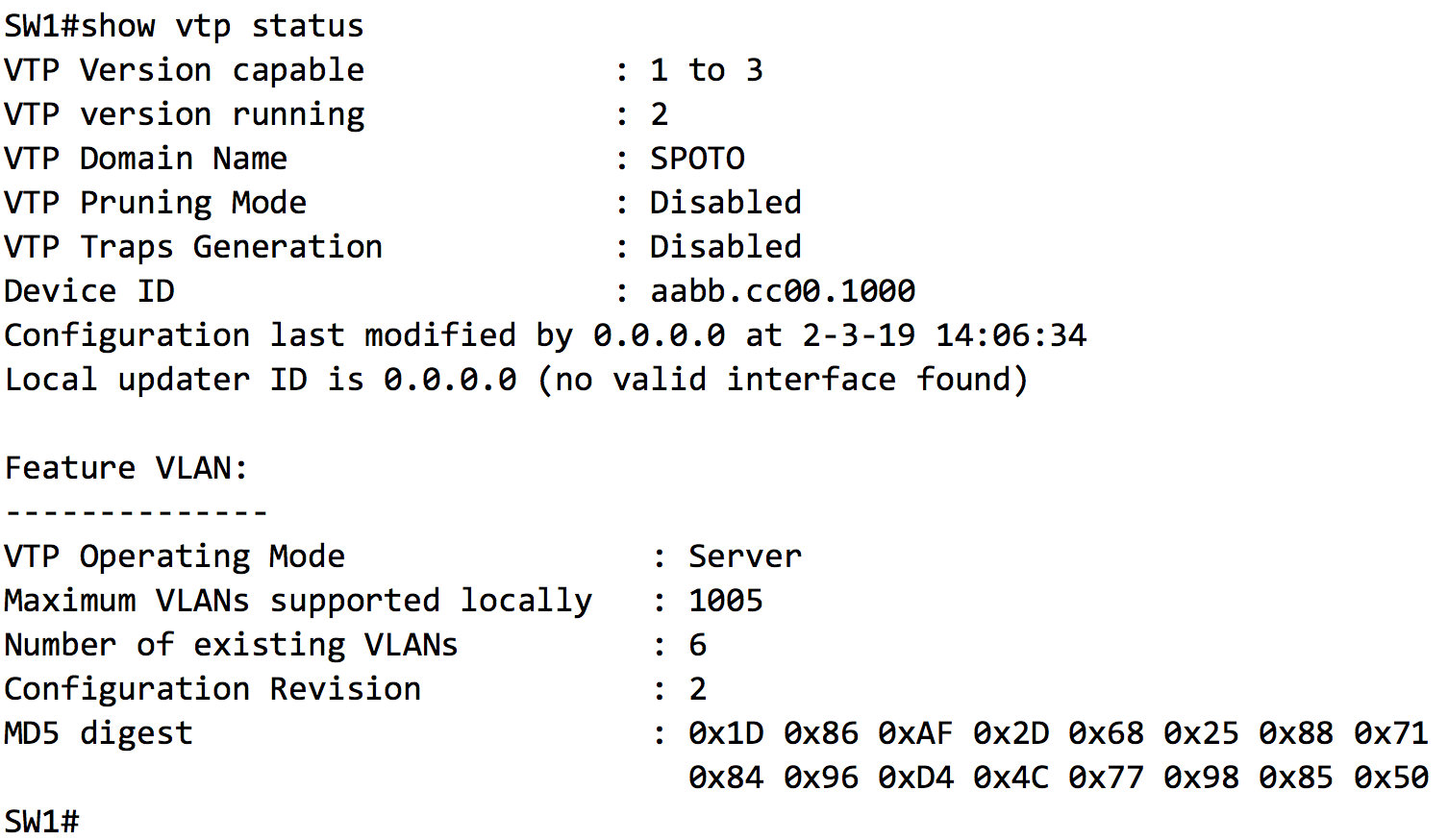1 SW1(config)#vtp version 2 2 SW1(config)#vtp mode server 3 Device mode already VTP Server for VLANS. 4 SW1(config)#vtp domain SPOTO 5 Changing VTP domain name from NULL to SPOTO 6 SW1(config)#vtp password P@s5w0rd 7 Setting device VTP password to P@s5w0rd