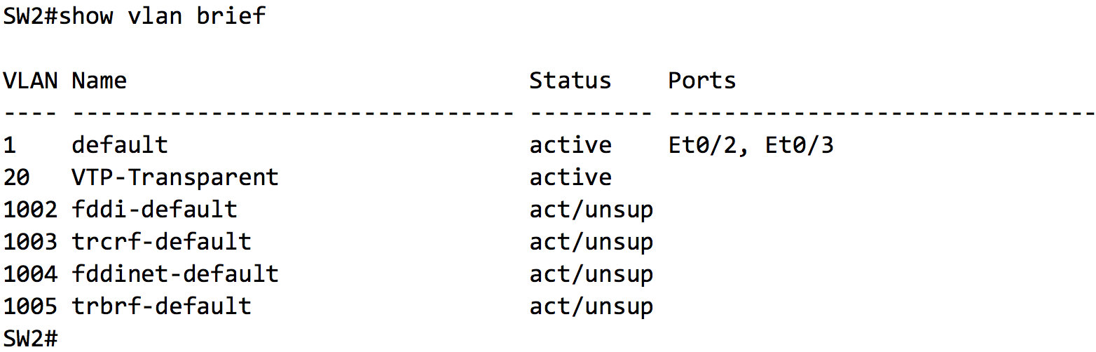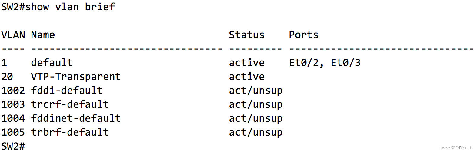 1 SW2(config)#vlan 20 2 SW2(config-vlan)#name VTP-Transparent