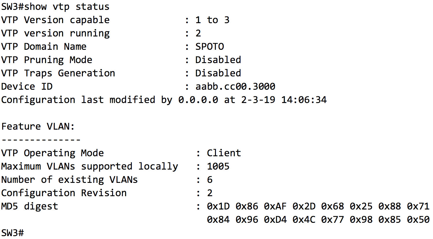 1 SW3(config)#vtp version 2 2 SW3(config)#vtp mode client 3 Setting device to VTP Client mode for VLANS. 4 SW3(config)#vtp domain SPOTO 5 Changing VTP domain name from NULL to SPOTO 6 SW3(config)#vtp password P@s5w0rd 7 Setting device VTP password to P@s5w0rd