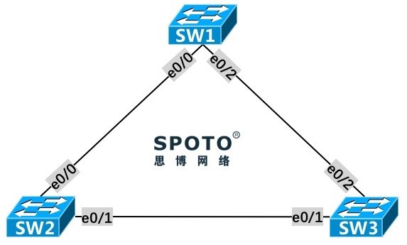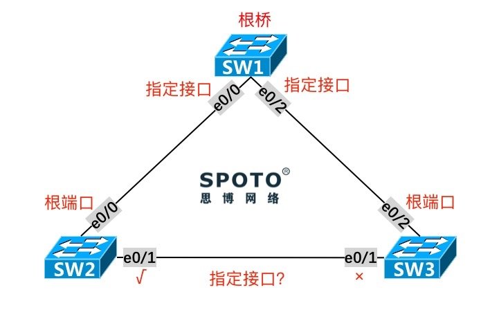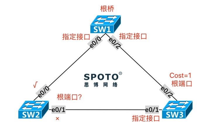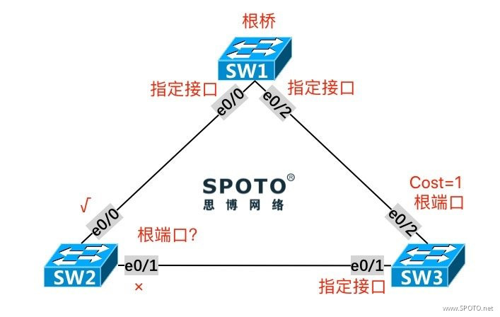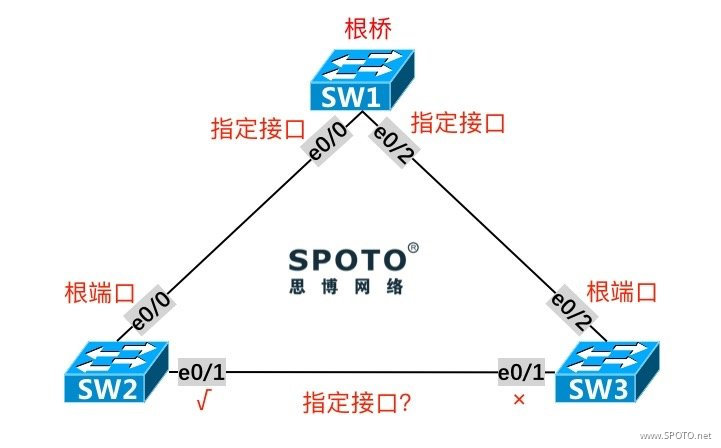 在本实验中,SW2的E0/1和SW3的E0/1距离根桥SW1的距离(Cost)相等,而SW2本身的 Bridge ID 较小,故SW2的E0/1成为指定接口,SW3的E0/1被阻塞