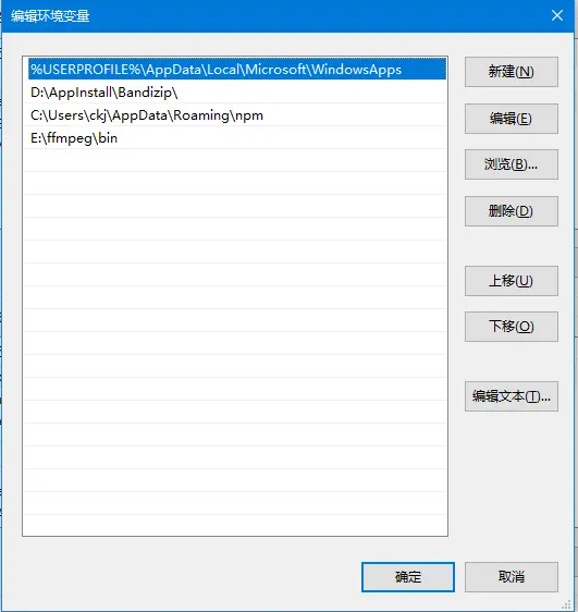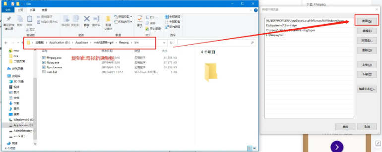 复制ffmpeg所在路径在编辑环境变量中新建粘贴