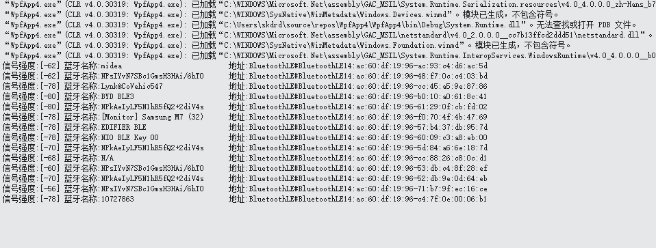 public class BluetoothLEDev { private string _SearchBTName; /// <summary> /// 要查找的蓝牙名称 /// </summary> public string SearchBTName { get { return _SearchBTName; } set { _SearchBTName = value; } } private int _SearchBTRssi; /// <summary> /// 查找的蓝牙名称对应的信号强度 /// </summary> public int SearchBTRssi { get { return _SearchBTRssi; } set { _SearchBTRssi = value; } } /// <summary> /// 是否搜索停止了 /// </summary> private bool _SearchStopped; public bool SearchStopped { get { return _SearchStopped; } set { _SearchStopped = value; } } public void ScanBluetooth(string BTName, int timeOut = 10) { SearchBTName = BTName; SearchStopped = false; string[] requestedProperties = { "System.Devices.Aep.IsConnected", "System.Devices.Aep.DeviceAddress", "System.Devices.Aep.Bluetooth.Le.IsConnectable", "System.Devices.Aep.SignalStrength", "System.Devices.Aep.IsPresent" }; string aqsAllBluetoothLEDevices = "(System.Devices.Aep.ProtocolId:=\"{bb7bb05e-5972-42b5-94fc-76eaa7084d49}\")"; DeviceWatcher deviceWatcher = DeviceInformation.CreateWatcher(aqsAllBluetoothLEDevices, requestedProperties, DeviceInformationKind.AssociationEndpoint); deviceWatcher.Added += DeviceWatcher_Added; deviceWatcher.Updated += DeviceWatcher_Updated; deviceWatcher.Stopped += DeviceWatcher_Stopped; long TickTime = Environment.TickCount + timeOut * 1000;//系统经过的毫秒数 Task.Factory.StartNew(() => { while (true) { if (Environment.TickCount > TickTime || SearchStopped)//找n秒或已经找到 { string strTemp; if (!SearchStopped) { strTemp = string.Format("时间到了呀-->{0}", timeOut); //LogHelper.WriteLogInfo(strTemp); } strTemp = string.Format("结束搜索蓝牙"); //LogHelper.WriteLogInfo(strTemp); deviceWatcher.Stop(); return; } else { Thread.Sleep(50); } } }); deviceWatcher.Start(); //LogHelper.WriteLogInfo("开始搜索蓝牙"); } private void DeviceWatcher_Added(DeviceWatcher sender, DeviceInformation args) { if (string.IsNullOrEmpty(args.Name)) { return; } var rssi = args.Properties.Single(d => d.Key == "System.Devices.Aep.SignalStrength").Value; if (rssi == null) { return; } int IRssi = int.Parse(rssi.ToString()); if (IRssi < -80) { return; } string strBTInfo = $"信号强度:[{IRssi}] 蓝牙名称:{(args.Name).PadRight(30, ' ')} 地址:{args.Id}"; Console.WriteLine(strBTInfo); //LogHelper.WriteLogInfo(strBTInfo); if (args.Name.Contains(SearchBTName)) { string strTemp = string.Format("搜索到蓝牙:{0},要查找的蓝牙名称:{1},信号强度:{2}找到了呀", args.Name, SearchBTName, IRssi); //LogHelper.WriteLogInfo(strTemp); SearchBTRssi = IRssi; SearchStopped = true; } } private void DeviceWatcher_Stopped(DeviceWatcher sender, object args) { SearchStopped = true; } private void DeviceWatcher_Updated(DeviceWatcher sender, DeviceInformationUpdate args) { } }