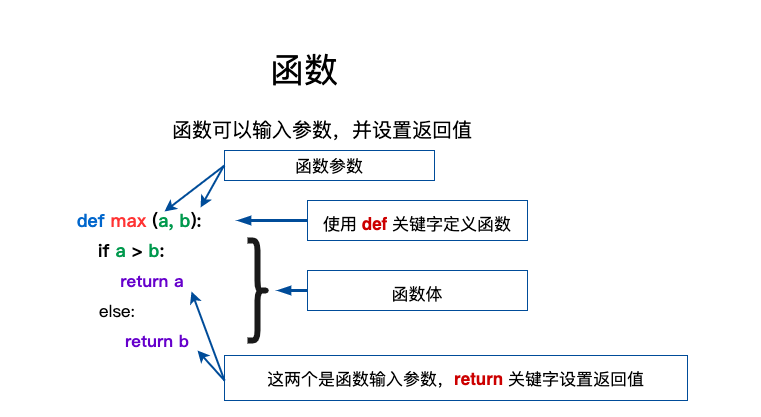 函数代码块以 def 关键词开头,后接函数标识符名称和圆括号 ()。