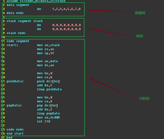 在程序中,段名就相当于一个标号,上面的指令 mov ax,data 的含义就是将名称为data的段的段地址送入ax。一个段中的数据的段地址可由段名代表,偏移地址就要看它在段中的位置了。如上面程序data段中的数据 “4”的地址就是:data:6(一个字型数据占两个字节)。