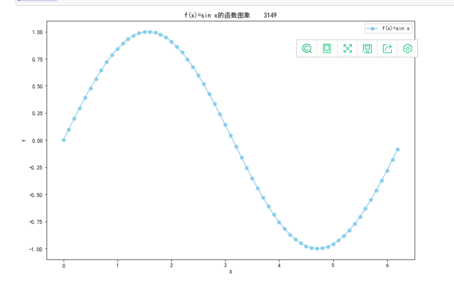 import numpy as np import matplotlib.pyplot as plt #导入绘图包 import math plt.rcParams['font.sans-serif'] = ['SimHei'] #解决中文显示问题 plt.rcParams['axes.unicode_minus'] = False # 解决中文显示问题 x=np.arange(0,2*math.pi,0.1)#以0.1为单位,生成0到6的数据 y=np.sin(x) plt.figure(figsize=(12,8)) plt.plot(x,y,color='skyblue',label='f(x)=sin x',marker='o') plt.title('f(x)=sin x的函数图象 3149') #加标题 plt.xlabel('X') plt.ylabel('Y') plt.legend() #显示图例 plt.show()