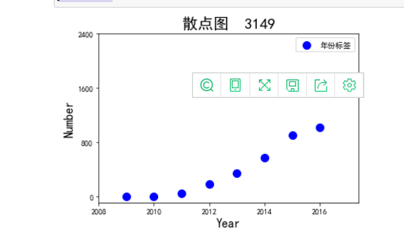 import matplotlib.pyplot as plt years=[2009,2010,2011,2012,2013,2014,2015,2016,2017] turnovers=[0.5,9.36,52,191,350,571,912,1027,1682] plt.figure() plt.scatter(years,turnovers,c='blue',s=100,label='年份标签') plt.xticks(range(2008,2017,2)) plt.yticks(range(0,3200,800)) plt.xlabel("Year",fontdict={'size':16}) plt.ylabel("Number",fontdict={'size':16}) plt.title("散点图 3149",fontdict={'size':20}) #legend标签位置 plt.legend(loc='best') plt.show()