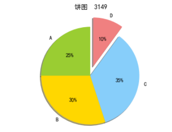 #饼图import matplotlib.pyplot as plt #The slices will be crdered and plotted counter-clockwise labels='A','B','C','D'#定义标签 sizes=[25,30,35,10]#每一块的比例 colors=['yellowgreen','gold','lightskyblue','lightcoral']#每一块的颜色 explode=(0,0,0,0.2)#突出显示,这里仅仅突出显示第二块(即‘D’) plt.pie(sizes,explode=explode,labels=labels,colors=colors,autopct='%1.lf%%', shadow=True,startangle=90) plt.axis('equal')#显示为圆(避免比例压缩为椭圆) plt.title("带突出饼图 3149") plt.show()