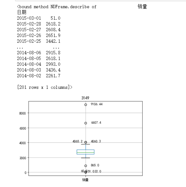 import pandas as pd catering_sale='E:\py mathph\JupyterLab-Portable-3.1.0-3.9\shujuwajue\data\catering_sale.xls' #餐饮数据 data=pd.read_excel(catering_sale,index_col=u'日期') #读取数据,指定“日期”列为索引列 print(data.describe) import matplotlib.pyplot as plt #导入图像库 plt.rcParams['font.sans-serif']=['SimHei'] #用来正常显示中文标签 plt.rcParams['axes.unicode_minus']=False #用来正常显示负号 plt.figure() #建立图像 p=data.boxplot(return_type='dict') #画箱型图,直接使用DetaFrame的方法 x=p['fliers'][0].get_xdata() #‘flies’即为异常值的标签 y=p['fliers'][0].get_ydata() y.sort()#从小大大依次排序,该方法直接改变原对象 ''' 用annotate添加注释 其中有些相近的点,注释会出现重叠,难以看清,需要一些技巧来控制 以下参数都输经过调试过的,需要具体问题具体调试 ''' for i in range(len(x)): if i>0: plt.annotate(y[i],xy=(x[i],y[i]),xytext=(x[i]+0.05-0.8/(y[i]-y[i-1]),y[i])) else: plt.annotate(y[i],xy=(x[i],y[i]),xytext=(x[i]+0.08,y[i])) plt.title('箱型图 3149') plt.show() #展示箱型图
