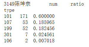 def xiaguang(i): # 自定义统计函数 j = i.loc[(i['fullURL'].str.contains('\.html')) == False, ['fullURL', 'fullURLId', 'pageTitle']] return j # 注意获取一次sql对象就需要重新访问一下数据库 engine = create_engine('mysql+pymysql://root:q12345@127.0.0.1:3306/text?charset=utf8') sql = pd.read_sql('gzdata', engine, chunksize=10000) # 分块读取数据库信息 counts5 = [xiaguang(i) for i in sql] counts5 = pd.concat(counts5) xg1 = counts5['fullURLId'].value_counts() print('3149 \n',xg1) # 求各个部分的占比 xg_ = pd.DataFrame(xg1) xg_.reset_index(inplace=True) xg_.columns = ['index', 'num'] xg_['perc'] = xg_['num'] / xg_['num'].sum() * 100 xg_.sort_values(by='num', ascending=False, inplace=True) xg_['type'] = xg_['index'].str.extract('(\d{3})') # 提取前三个数字作为类别id xgs_ = xg_[['type', 'num']].groupby('type').sum() # 按类别合并 xgs_.sort_values(by='num', ascending=False, inplace=True) # 降序排列 xgs_['percentage'] = xgs_['num'] / xgs_['num'].sum() * 100 print(xgs_.round(4))