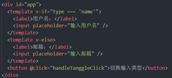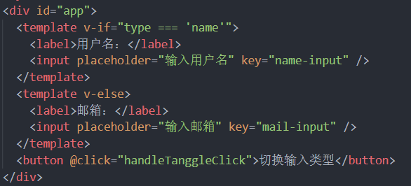 问题:键入内容后,点击切换按钮,虽然DOM变了,但是之前在输入框键入的内容并没有改变,只是替换了placeholder的内容,说明<ipnut>元素被复用了。Vue在渲染元素时,出于效率考虑,会尽可能地复用已有的元素而非重新渲染。