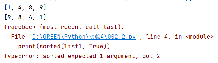1 list1 = [1, 9, 8, 4] 2 print(sorted(list1) ) 3 print(sorted(list1, reverse=True)) 4 print(sorted(list1, True))