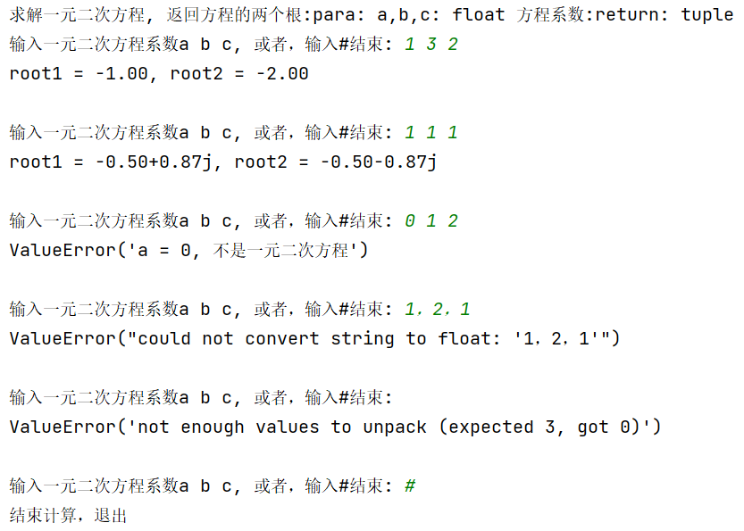 1 def solve(a, b, c): 2 '''求解一元二次方程, 返回方程的两个根:para: a,b,c: float 方程系数:return: tuple''' 3 delta = b*b - 4*a*c 4 delta_sqrt = abs(delta)**0.5 5 p1 = -b/2/a 6 p2 = delta_sqrt/2/a 7 if delta >= 0: 8 root1 = p1 + p2 9 root2 = p1 - p2 10 else: 11 root1 = complex(p1, p2) 12 root2 = complex(p1, -p2) 13 return root1, root2 14 15 print(solve.__doc__) 16 while True: 17 try: 18 t = input('输入一元二次方程系数a b c, 或者,输入#结束: ') 19 if t == '#': 20 print('结束计算,退出') 21 break 22 a, b, c = map(float, t.split()) 23 if a == 0: 24 raise ValueError('a = 0, 不是一元二次方程') 25 except ValueError as e: 26 print(repr(e)) 27 print() 28 except: 29 print('有其它错误发生\n') 30 else: 31 root1, root2 = solve(a, b, c) 32 print(f'root1 = {root1:.2f}, root2 = {root2:.2f}') 33 print()
