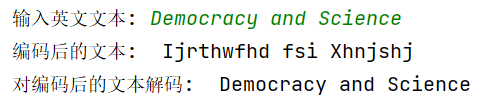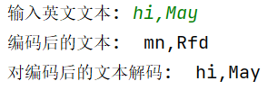 1 # 编码函数encoder()定义 2 def encoder(text): 3 lst = list(text) 4 for i in range(len(lst)): 5 if 'a' <= lst[i].lower() <= 'u': 6 lst[i] = chr(ord(lst[i]) + 5) 7 elif 'v' <= lst[i].lower() <= 'z': 8 lst[i] = chr(ord(lst[i]) - 21) 9 else: 10 pass 11 return ''.join(lst) 12 # 解码函数decoder()定义 13 def decoder(text): 14 lst = list(text) 15 for i in range(len(lst)): 16 if 'f' <= lst[i].lower() <= 'z': 17 lst[i] = chr(ord(lst[i]) - 5) 18 elif 'a' <= lst[i].lower() <= 'e': 19 lst[i] = chr(ord(lst[i]) + 21) 20 else: 21 pass 22 return ''.join(lst) 23 24 # 主体代码逻辑 25 text = input('输入英文文本: ') 26 encoded_text = encoder(text) 27 print('编码后的文本: ', encoded_text) 28 decoded_text = decoder(encoded_text) 29 print('对编码后的文本解码: ', decoded_text)