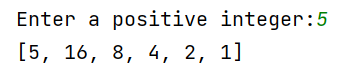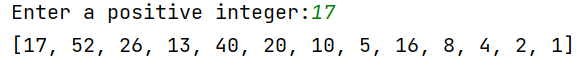 1 def collatz(n): 2 if n%2==0: 3 return n//2 4 else: 5 return n*3+1 6 7 try: 8 n=eval(input('Enter a positive integer:')) 9 if n<=0 or n !=int(n): 10 raise 11 12 except: 13 print('Error:must be a positive integer') 14 else: 15 lst=[n] 16 while n!=1: 17 n=collatz(n) 18 lst.append(n) 19 print(lst)