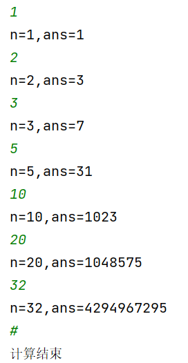 1 def func(n): 2 if n==0: 3 return 0 4 else: 5 return 2*func(n-1)+1 6 7 8 while True: 9 x=input() 10 if x=='#': 11 print('计算结束') 12 break 13 n=int(x) 14 ans=func(n) 15 print(f'n={n},ans={ans}')