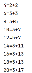 1 def is_prime(n): 2 i=2 3 while i<n and n%i!=0: 4 i+=1 5 if i==n: 6 return 'True' 7 else: 8 return 'False' 9 10 lst=[] 11 for i in range(2,21): 12 if is_prime(i)=='True': 13 lst.append(i) 14 15 for j in range(4,21,2): 16 for k in lst: 17 if is_prime(j-k)=='True': 18 print(f'{j}={k}+{j-k}') 19 break