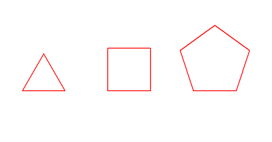 1 from turtle import * 2 3 def move(x, y):#画笔移动到坐标(x,y)处 4 penup() 5 goto(x, y) 6 pendown() 7 8 def draw(n, size = 100):#绘制边长为size的正n变形 9 for i in range(n): 10 forward(size) 11 left(360/n) 12 13 def main(): 14 pensize(2) 15 pencolor('red') 16 move(-200, 0) 17 draw(3) 18 move(0, 0) 19 draw(4) 20 move(200, 0) 21 draw(5) 22 hideturtle() 23 done() 24 main()