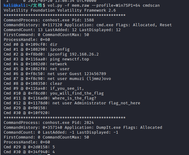 vol.py -f mem.raw --profile=Win7SP1x64 cmdscan