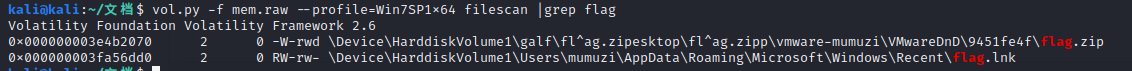 vol.py -f mem.raw --profile=Win7SP1x64 filescan | grep flag