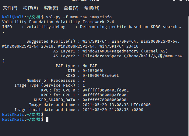 由于我的kali不是自带的volatility,我就自己安装了一个(安装的坑未免太多了吧!),安装了一个晚上 ,疯狂踩坑。。。。。。(所以为什么不换一个kali版本???)