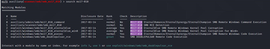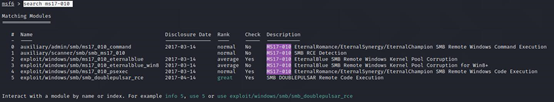 1.继续使用命令”search ms17-010”,找到可利用模块