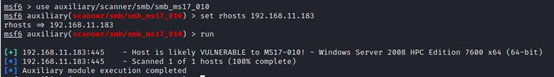 2.利用模块1 ” use auxiliary/scanner/smb/smb_ms17_010” 进行扫描