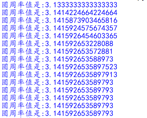 pi += 1/pow(16, k) * (4 / (8 * k + 1) - 2 /(8 * k + 4) - 1/(8 * k + 5) - 1 /(8 * k + 6))