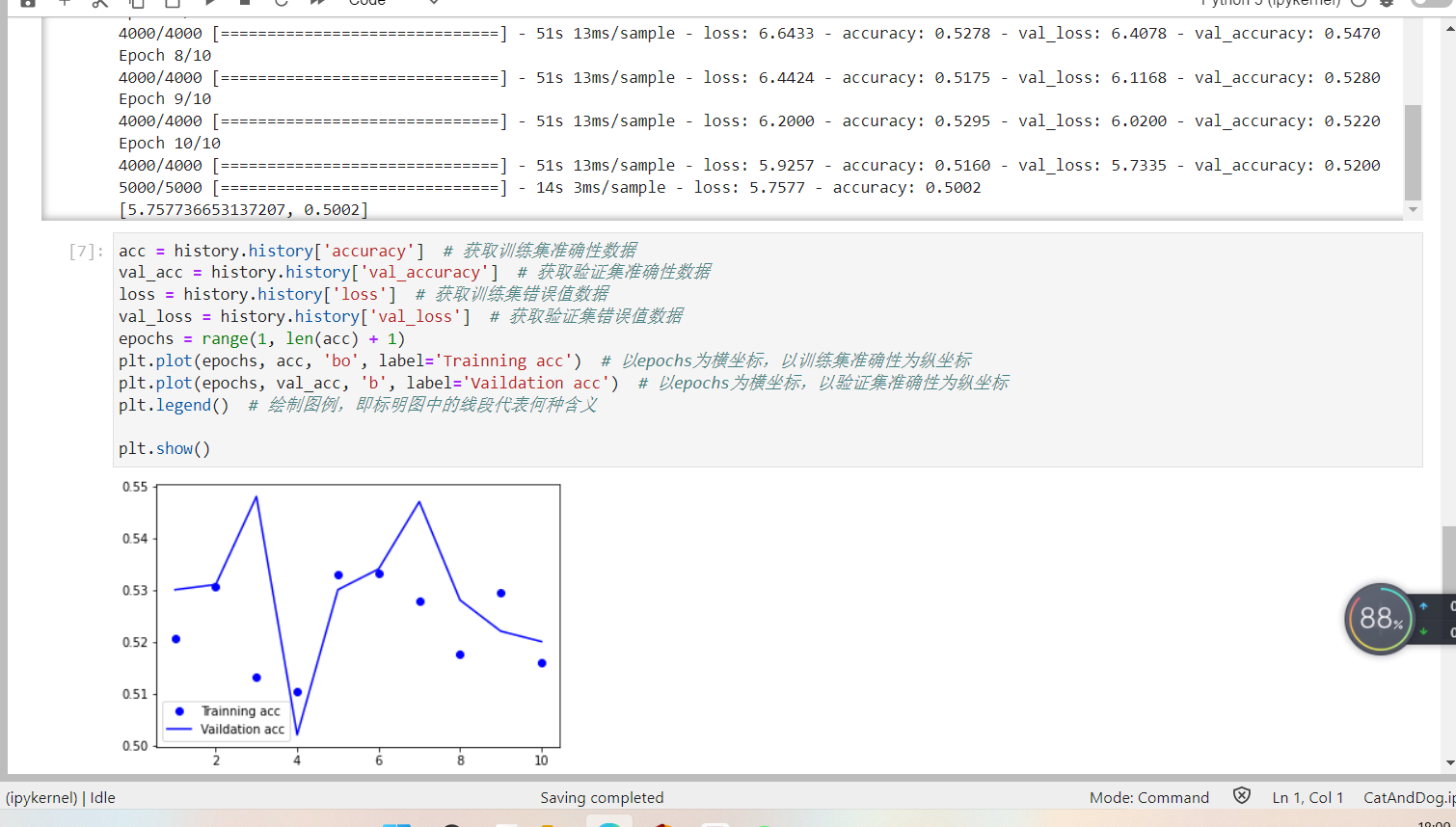 import tensorflow as tf from tensorflow import keras from tensorflow.keras import layers, regularizers import numpy as np import os import cv2 import matplotlib.pyplot as plt os.environ["CUDA_VISIBLE_DEVICES"] = "1" resize = 224 path ="D:/anacana/train" def load_data(): imgs = os.listdir(path) num = len(imgs) train_data = np.empty((5000, resize, resize, 3), dtype="int32") train_label = np.empty((5000, ), dtype="int32") test_data = np.empty((5000, resize, resize, 3), dtype="int32") test_label = np.empty((5000, ), dtype="int32") for i in range(5000): if i % 2: train_data[i] = cv2.resize(cv2.imread(path+'/'+ 'dog.' + str(i) + '.jpg'), (resize, resize)) train_label[i] = 1 else: train_data[i] = cv2.resize(cv2.imread(path+'/' + 'cat.' + str(i) + '.jpg'), (resize, resize)) train_label[i] = 0 for i in range(5000, 10000): if i % 2: test_data[i-5000] = cv2.resize(cv2.imread(path+'/' + 'dog.' + str(i) + '.jpg'), (resize, resize)) test_label[i-5000] = 1 else: test_data[i-5000] = cv2.resize(cv2.imread(path+'/' + 'cat.' + str(i) + '.jpg'), (resize, resize)) test_label[i-5000] = 0 return train_data, train_label, test_data, test_label def vgg16(): weight_decay = 0.0005 nb_epoch = 100 batch_size = 32 # layer1 model = keras.Sequential() model.add(layers.Conv2D(64, (3, 3), padding='same', input_shape=(224, 224, 3), kernel_regularizer=regularizers.l2(weight_decay))) model.add(layers.Activation('relu')) model.add(layers.BatchNormalization()) model.add(layers.Dropout(0.3)) # layer2 model.add(layers.Conv2D(64, (3, 3), padding='same', kernel_regularizer=regularizers.l2(weight_decay))) model.add(layers.Activation('relu')) model.add(layers.BatchNormalization()) model.add(layers.MaxPooling2D(pool_size=(2, 2))) # layer3 model.add(layers.Conv2D(128, (3, 3), padding='same', kernel_regularizer=regularizers.l2(weight_decay))) model.add(layers.Activation('relu')) model.add(layers.BatchNormalization()) model.add(layers.Dropout(0.4)) # layer4 model.add(layers.Conv2D(128, (3, 3), padding='same', kernel_regularizer=regularizers.l2(weight_decay))) model.add(layers.Activation('relu')) model.add(layers.BatchNormalization()) model.add(layers.MaxPooling2D(pool_size=(2, 2))) # layer5 model.add(layers.Conv2D(256, (3, 3), padding='same', kernel_regularizer=regularizers.l2(weight_decay))) model.add(layers.Activation('relu')) model.add(layers.BatchNormalization()) model.add(layers.Dropout(0.4)) # layer6 model.add(layers.Conv2D(256, (3, 3), padding='same', kernel_regularizer=regularizers.l2(weight_decay))) model.add(layers.Activation('relu')) model.add(layers.BatchNormalization()) model.add(layers.Dropout(0.4)) # layer7 model.add(layers.Conv2D(256, (3, 3), padding='same', kernel_regularizer=regularizers.l2(weight_decay))) model.add(layers.Activation('relu')) model.add(layers.BatchNormalization()) model.add(layers.MaxPooling2D(pool_size=(2, 2))) # layer8 model.add(layers.Conv2D(512, (3, 3), padding='same', kernel_regularizer=regularizers.l2(weight_decay))) model.add(layers.Activation('relu')) model.add(layers.BatchNormalization()) model.add(layers.Dropout(0.4)) # layer9 model.add(layers.Conv2D(512, (3, 3), padding='same', kernel_regularizer=regularizers.l2(weight_decay))) model.add(layers.Activation('relu')) model.add(layers.BatchNormalization()) model.add(layers.Dropout(0.4)) # layer10 model.add(layers.Conv2D(512, (3, 3), padding='same', kernel_regularizer=regularizers.l2(weight_decay))) model.add(layers.Activation('relu')) model.add(layers.BatchNormalization()) model.add(layers.MaxPooling2D(pool_size=(2, 2))) # layer11 model.add(layers.Conv2D(512, (3, 3), padding='same', kernel_regularizer=regularizers.l2(weight_decay))) model.add(layers.Activation('relu')) model.add(layers.BatchNormalization()) model.add(layers.Dropout(0.4)) # layer12 model.add(layers.Conv2D(512, (3, 3), padding='same', kernel_regularizer=regularizers.l2(weight_decay))) model.add(layers.Activation('relu')) model.add(layers.BatchNormalization()) model.add(layers.Dropout(0.4)) # layer13 model.add(layers.Conv2D(512, (3, 3), padding='same', kernel_regularizer=regularizers.l2(weight_decay))) model.add(layers.Activation('relu')) model.add(layers.BatchNormalization()) model.add(layers.MaxPooling2D(pool_size=(2, 2))) model.add(layers.Dropout(0.5)) # layer14 model.add(layers.Flatten()) model.add(layers.Dense(512, kernel_regularizer=regularizers.l2(weight_decay))) model.add(layers.Activation('relu')) model.add(layers.BatchNormalization()) # layer15 model.add(layers.Dense(512, kernel_regularizer=regularizers.l2(weight_decay))) model.add(layers.Activation('relu')) model.add(layers.BatchNormalization()) # layer16 model.add(layers.Dropout(0.5)) model.add(layers.Dense(2)) model.add(layers.Activation('softmax')) return model #if __name__ == '__main__': train_data, train_label, test_data, test_label = load_data() train_data = train_data.astype('float32') test_data = test_data.astype('float32') train_label = keras.utils.to_categorical(train_label, 2) test_label = keras.utils.to_categorical(test_label, 2) #定义训练方法,超参数设置 model = vgg16() sgd = tf.keras.optimizers.SGD(lr=0.01, decay=1e-6, momentum=0.9, nesterov=True) #设置优化器为SGD model.compile(loss='categorical_crossentropy', optimizer=sgd, metrics=['accuracy']) history = model.fit(train_data, train_label, batch_size=20, epochs=10, validation_split=0.2, #把训练集中的五分之一作为验证集 shuffle=True) scores = model.evaluate(test_data,test_label,verbose=1) print(scores) model.save('model/vgg16dogcat.h5') acc = history.history['accuracy'] # 获取训练集准确性数据 val_acc = history.history['val_accuracy'] # 获取验证集准确性数据 loss = history.history['loss'] # 获取训练集错误值数据 val_loss = history.history['val_loss'] # 获取验证集错误值数据 epochs = range(1, len(acc) + 1) plt.plot(epochs, acc, 'bo', label='Trainning acc') # 以epochs为横坐标,以训练集准确性为纵坐标 plt.plot(epochs, val_acc, 'b', label='Vaildation acc') # 以epochs为横坐标,