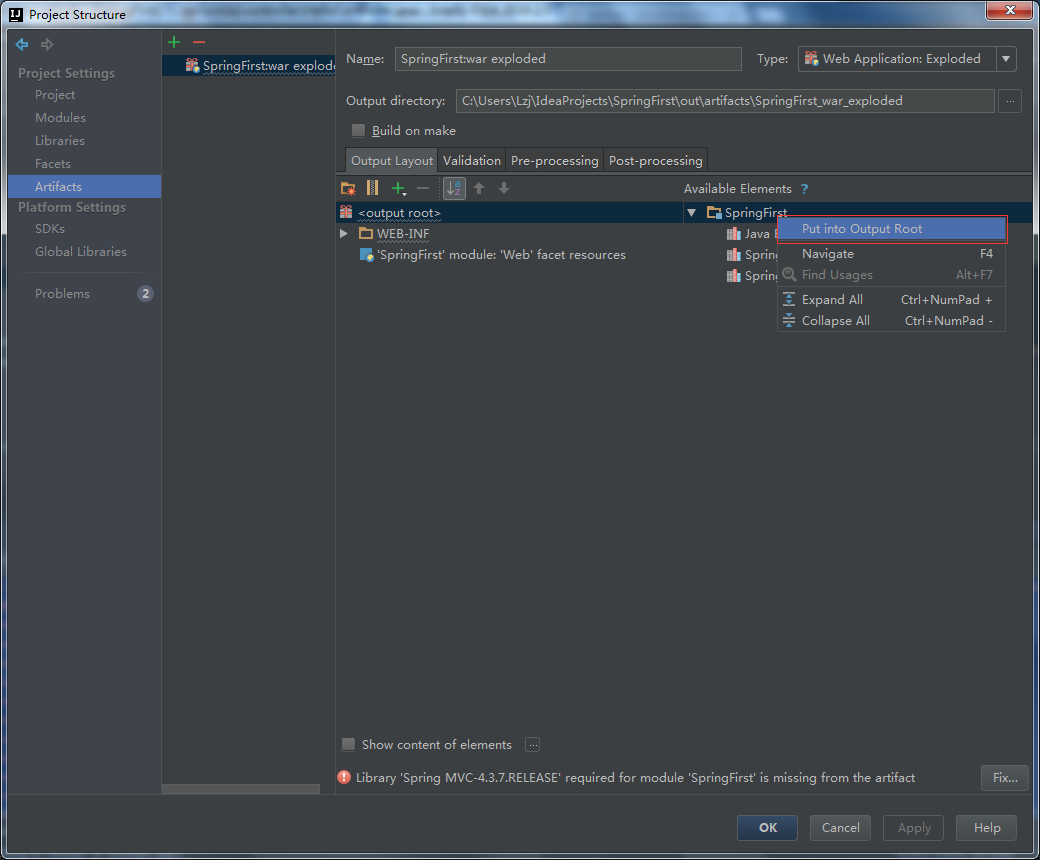 File > Project Structure > Artifacts > 在右侧Output Layout右击项目名,选择Put into Output Root,见下面截图: