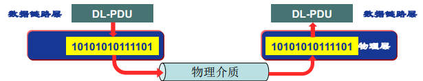 3.依次类推,在网络层的协议数据单元交给数据链路层后,注意数据链路层会将其加头加尾,封装成帧。再交给物理层进行传输。