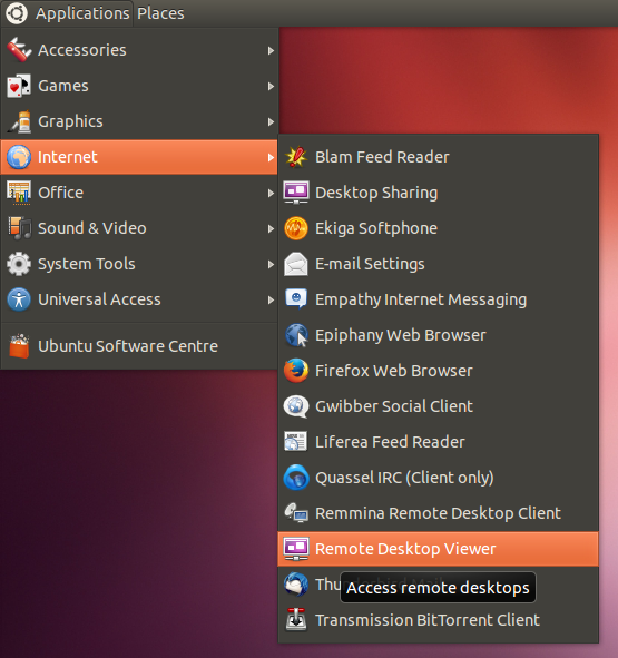 你的Linux发行版本号可能已经包括了Remote Desktop Viewer(远程桌面)程序。你能够通过这个程序使用VNC连接你的树莓派。通常能够在Applications/Internet菜单以下找到这个程序(以下是Ubuntu的样例);