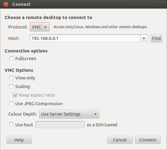 一旦你选择Remote Desktop Viewer程序并点击Connect(连接)button,你将会看到下面对话框。在Protocol(协议)选项中选择VNC。然后输入树莓派的IP地址以及屏幕编号(比如:0或者:1),完整样例:192.168.0.6:1。