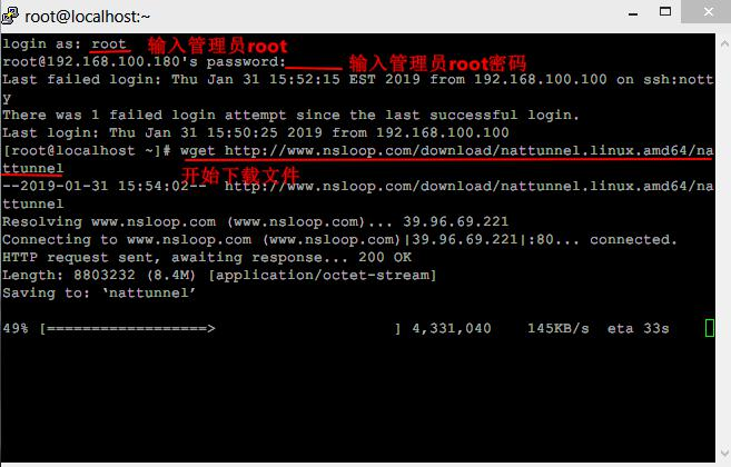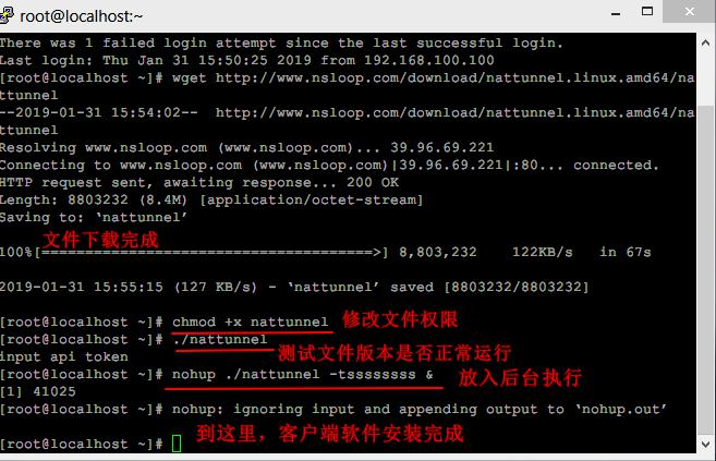 1. sudo -i 2. wget https://www.nsloop.com/download/nattunnel.linux.arm/nattunnel(下载nattunnel) 3. chmod +x nattunnel (修改文件权限) 4. ./nattunnel (测试版本是否能够正常运行)