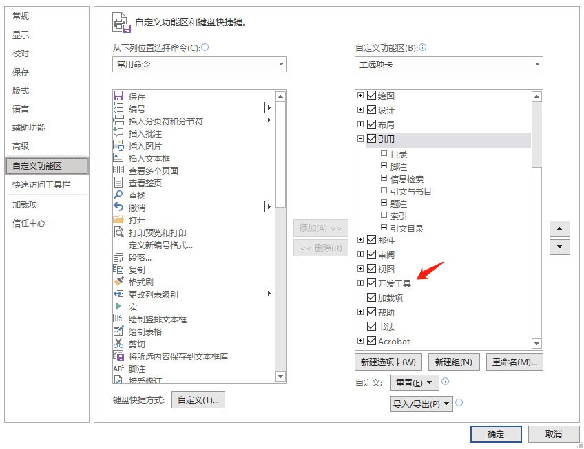 3. 右键菜单栏,自定义功能区,勾选开发工具