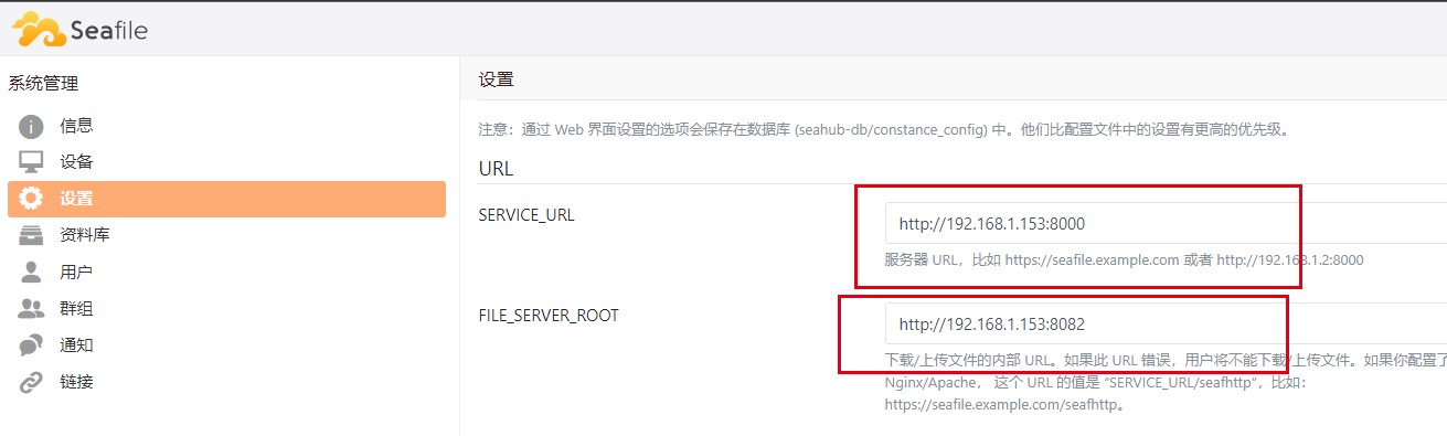 局域网下登录http://192.168.1.101:8000,输入用户名,密码,即可进入seafile后台,点击右上角系统管理->设置,更换为你的ip:8082