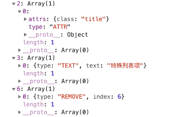 import { ATTR, TEXT, REPLACE, REMOVE }from '.patchTypes'; //从当前解构 //声明 let patches ={}, vnIndex = 0; function domDiff(oldVDom,newVDom){ let index = 0; vNodeWalk(oldVDom,newVDom,index); //虚拟节点遍历 return patches; } function vNodeWalk(oldNode,newNode,index){ let vnPatch = []; if(!newNode){ vnPatch.push({ type:REMOVE, index }) }else if(typeof oldNode === 'string' && typeof newNode === 'string'){ if(oldNode !== newNode){ vnPatch.push({ type:TEXT, text:newNode }) } } else if(oldNode.type === newNode.type){ const attrPatch = attrsWalk(oldNode.props,newNode.props); console.log(Object.keys(attrPatch));//一层 class if(Object.keys(attrPatch).length>0){ vnPatch.push({ type:ATTR, attrs:attrPatch }); } //遍历子 childrenWalk(oldNode.children,newNode.children); } else{ vnPatch.push ({ type:REPLACE, newNode }); } //判断是否有patch if(vnPatch.length>0){ patches[index] = vnPatch; } } //对比props function attrsWalk( oldAttrs,newAttrs){ let attrPatch={}; //修改属性 for (let key in oldAttrs){ if(oldAttrs[key]!== newAttrs){ attrPatch[key] = newAttrs[key]; //打补丁 } } //是否有属性 for (let key in newAttrs){ //遍历新,对比旧判断是否有 if(!oldAttrs.hasOwnProperty(key)){ attrPatch[key] = newAttrs[key]; } } return attrPatch; } function childrenWalk(oldChildren, newChildren){ oldChildren.map((c,idx) => { vNodeWalk(c,newChildren[idx], ++vnIndex) }) } export default domDiff;