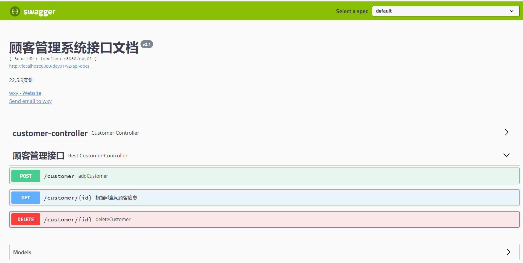 @Configuration @EnableSwagger2 @EnableWebMvc //开启swagger配置 public class SwaggerConfig implements WebMvcConfigurer { @Override public void addResourceHandlers(ResourceHandlerRegistry registry) { registry.addResourceHandler("/**").addResourceLocations( "classpath:/static/"); registry.addResourceHandler("swagger-ui.html").addResourceLocations( "classpath:/META-INF/resources/"); registry.addResourceHandler("/webjars/**").addResourceLocations( "classpath:/META-INF/resources/webjars/"); WebMvcConfigurer.super.addResourceHandlers(registry); } //需要一个docker对象 @Bean public Docket getDocket() { Docket docket = new Docket(DocumentationType.SWAGGER_2) .apiInfo(getApiInfo())//指定接口说明书 .select()//指定监控哪些接口 .apis( RequestHandlerSelectors.basePackage("com.example.demo1.controller") ).paths(PathSelectors.any()) //指定文档的扫描范围 .build(); return docket; } public ApiInfo getApiInfo() { ApiInfo apiInfo = new ApiInfoBuilder() .title("顾客管理系统接口文档") .description("22.5.9实训") .version("v2.1") .contact( new Contact("wxy", "https://www.cnblogs.com/clematis", "15122624600@163.com") ).build(); return apiInfo; } }