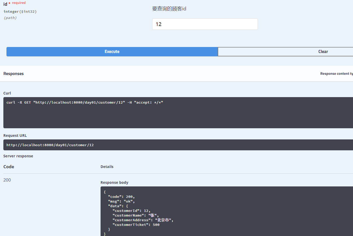 @Api(tags = "顾客管理接口") @ApiOperation(value = "根据id查询顾客信息", notes = "注意事项") @ApiImplicitParam(example = "0", paramType = "path", name = "id" , value = "要查询的顾客id", required = true, dataType = "int") //paramType取值:header query(url?id=1) path()