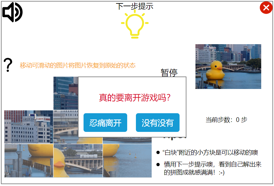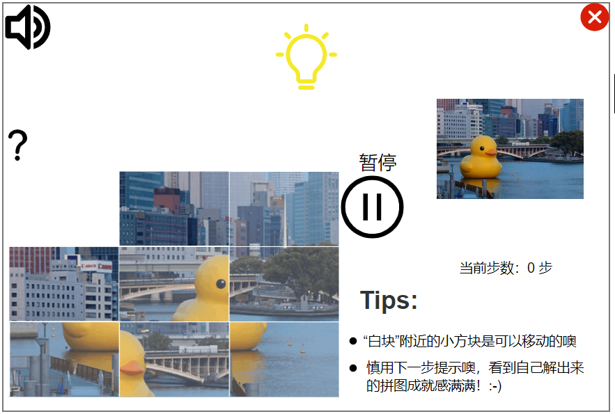 隐藏功能:问号--提示文本,灯泡--下一步提示,X--离开提示