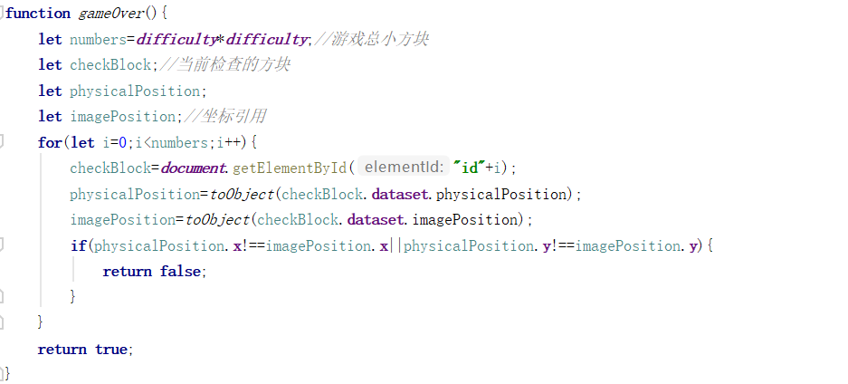 使用一个[difficulty][difficulty]的二维数组来管理小方块,只需要比较所有小方块的物理坐标和图片坐标是否一致就可以判断是否所有的小方块均已归位,即游戏是否结束