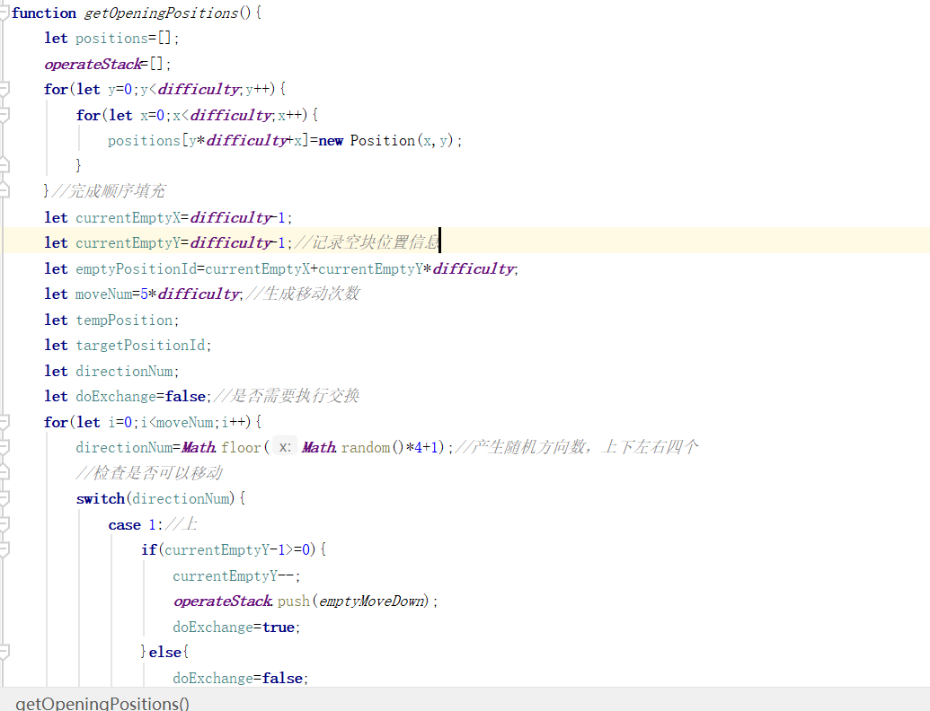 在getOpeningPosition()函数里模拟操作交换小方块时,把操作的反动作压入操作栈。当点击提示时,从操作栈弹出一个函数对象并执行,当栈空时,游戏场景被还原,即游戏结束