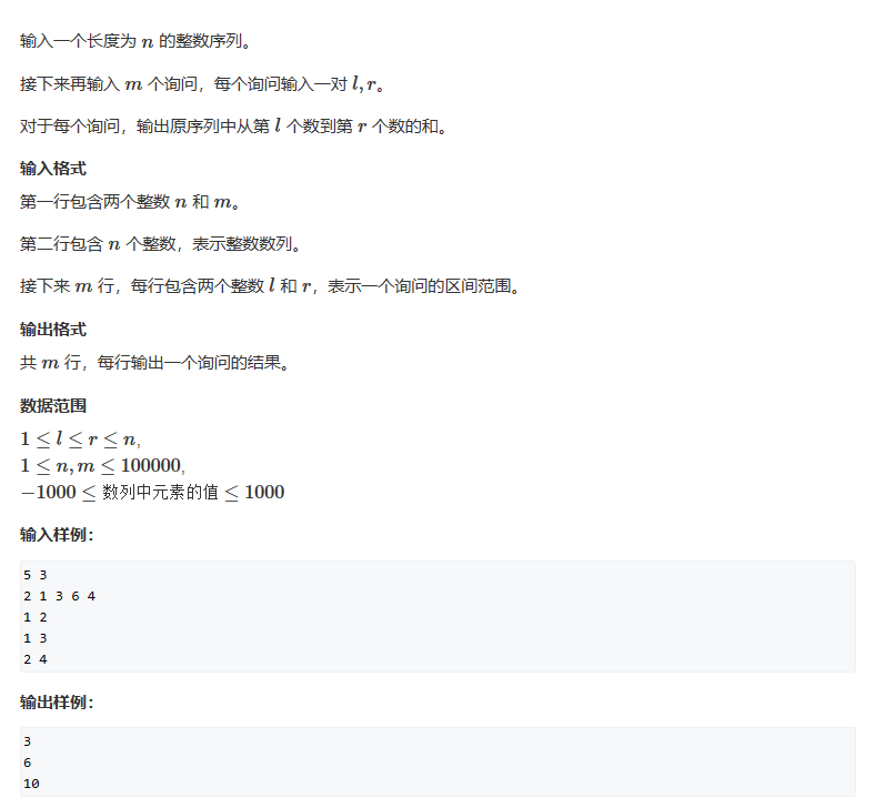 #include<iostream> using namespace std; const int N = 100010; int n,m; int a[N] , s[N]; int main(){ cin>>n>>m; //按惯例,前缀一定要是一个1 for(int i = 1 ; i <= n ; i++){ cin>>a[i]; } for(int i = 1 ; i <= n ; i ++){ s[i] = s[i-1] + a[i]; } while(m--){ int l,r; cin>>l>>r; printf("%d\n",s[r] -s[l-1]); } return 0; }
