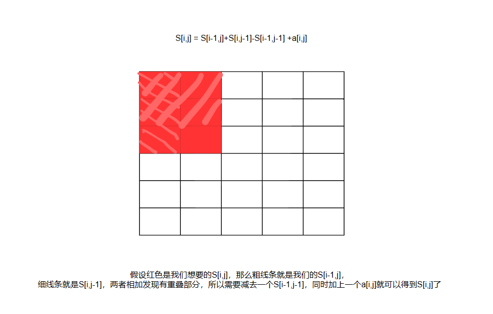 由于那么求出前缀和就可以求解二维的某段区间的值了,这里是图解: