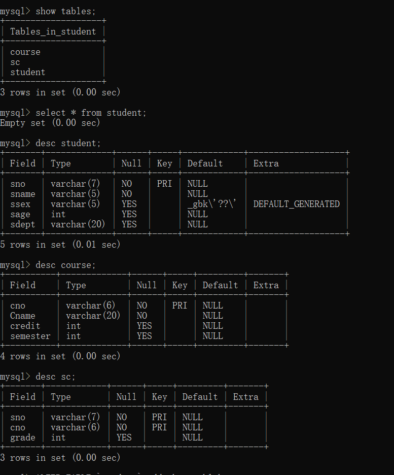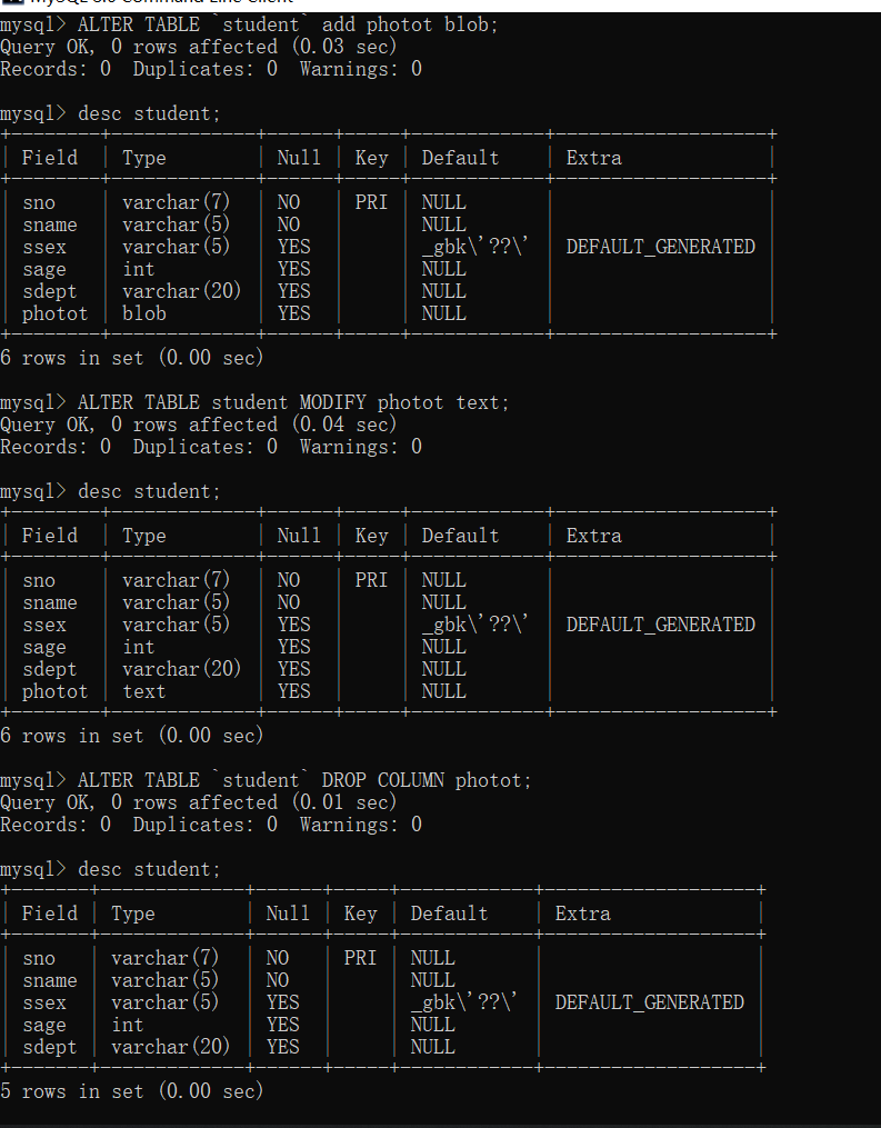给表student添加字段 photot, 类型blob;修改字段photo的类型为text; 删除字段photo.