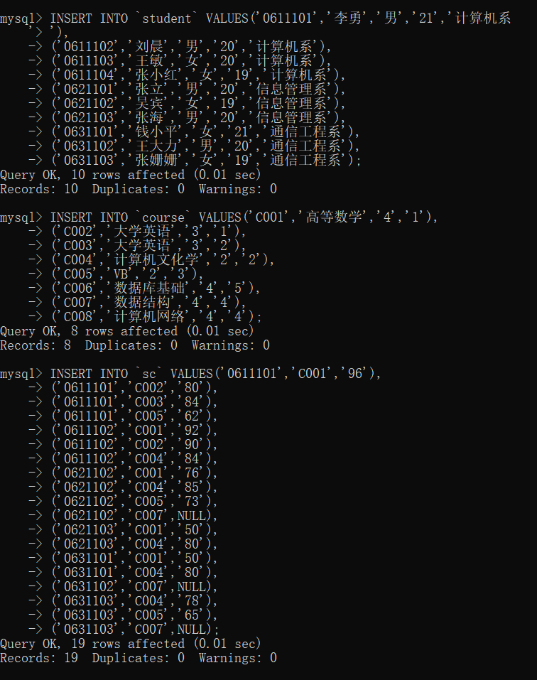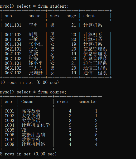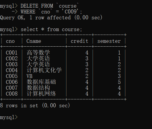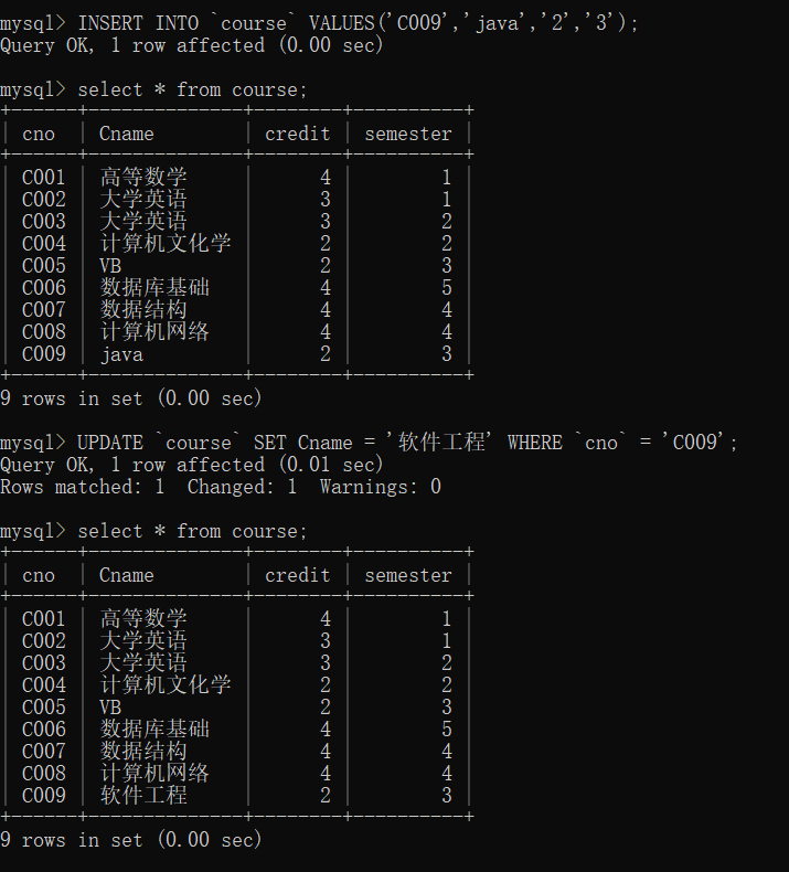 3.2 在course 表中添加数据 ('C009','java','2','3'); 把java改为 软件工程; 删除这条数据。