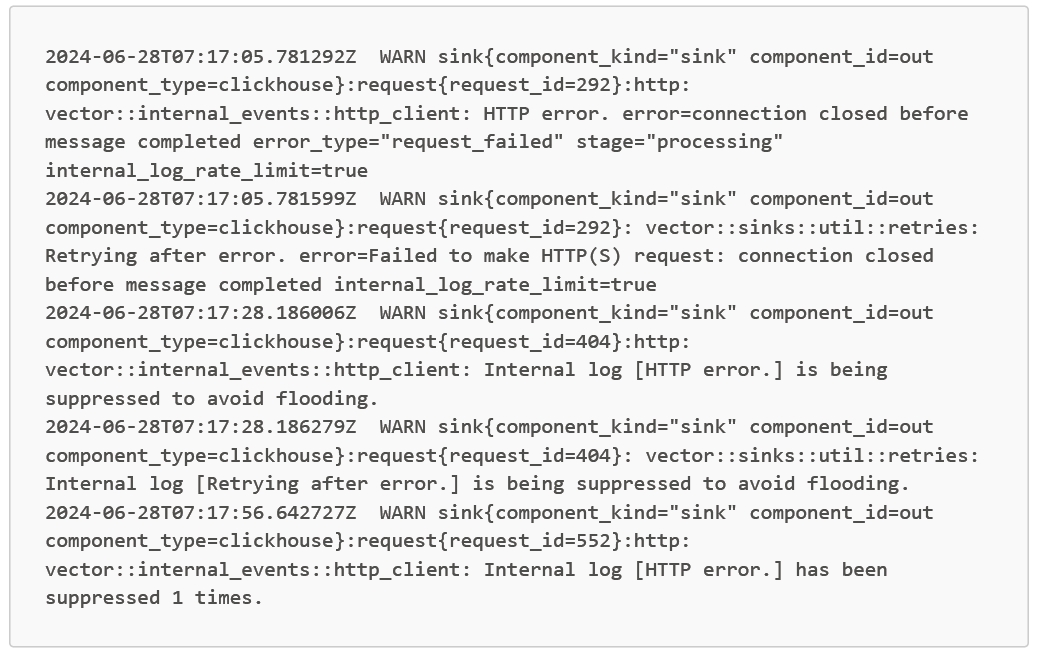 在导入过程中,Vector有告警信息。已对导入结果检查,日志数量没有问题。