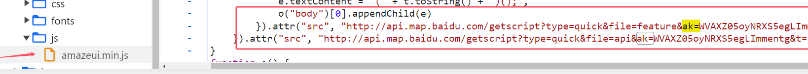 在我们使用一些导航地图的时候,在创建web服务的API时候,就可能会把我们的key值或ak值(百度地图的密钥叫ak)给泄露出来,像这个可以直接在改站点的网页源代码检索泄露出来的key或者ak值
