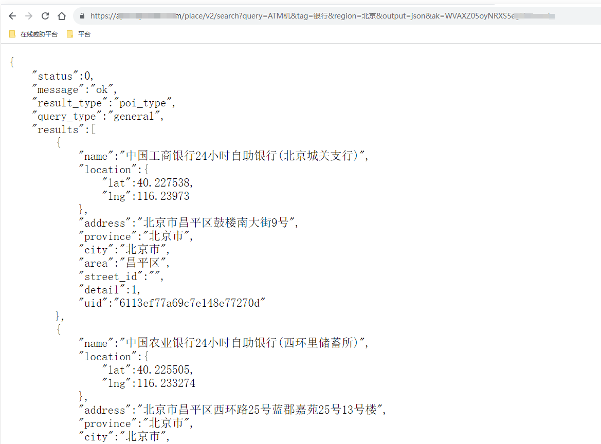 高德webapi: https://restapi.amap.com/v3/direction/walking?origin=116.434307,39.90909&destination=116.434446,39.90816&key=这里写key 高德jsapi: https://restapi.amap.com/v3/geocode/regeo?key=这里写key&s=rsv3&location=116.434446,39.90816&callback=jsonp_258885_&platform=JS 高德小程序定位: https://restapi.amap.com/v3/geocode/regeo?key=这里写key&location=117.19674%2C39.14784&extensions=all&s=rsx&platform=WXJS&appname=c589cf63f592ac13bcab35f8cd18f495&sdkversion=1.2.0&logversion=2.0 百度webapi: https://api.map.baidu.com/place/v2/search?query=ATM机&tag=银行®ion=北京&output=json&ak=这里写key 百度webapiIOS版: https://api.map.baidu.com/place/v2/search?query=ATM机&tag=银行®ion=北京&output=json&ak=这里写key=iPhone7%2C2&mcode=com.didapinche.taxi&os=12.5.6 腾讯webapi: https://apis.map.qq.com/ws/place/v1/search?keyword=酒店&boundary=nearby(39.908491,116.374328,1000)&key=这里写key