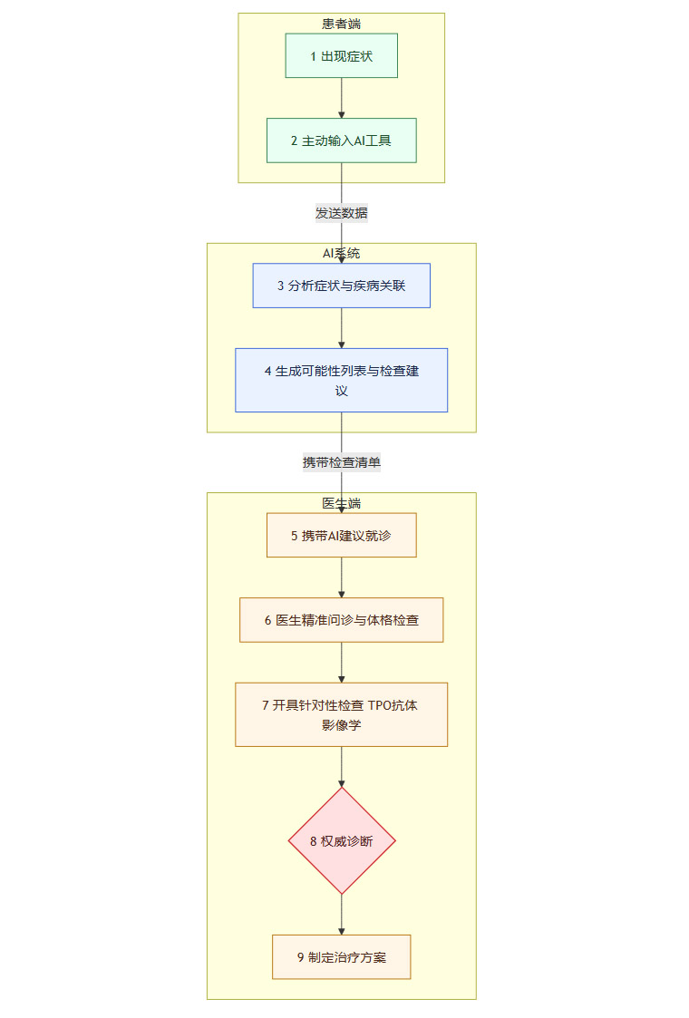 提出验证路径为了验证这个高概率假设,AI给出了最直接、成本效益最高的验证方法——建议进行TPO抗体检测。这是一个非常精准的建议,远比进行全身CT等昂贵且有辐射的“大撒网”式检查要高明。