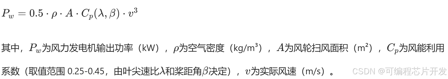 风力发电子系统通过风力发电机组将风能转化为电能,核心设备包括风轮、齿轮箱、发电机(多为永磁同步发电机)及变流器。其出力特性直接依赖风速,数学模型可简化为: